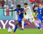 Nov 29, 2022; Doha, Qatar; United States of America midfielder Yunus Musah (6) battles for the ball against Iran midfielder Mehdi Torabi (16) during the second half of a group stage match during the 2022 [...]
