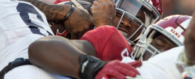 Alabama Crimson Tide quarterback Jalen Milroe (4) dives into the [...]
