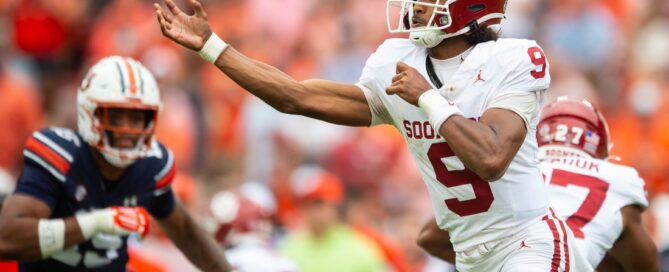 Oklahoma Sooners quarterback Michael Hawkins Jr. (9) throws the ball [...]