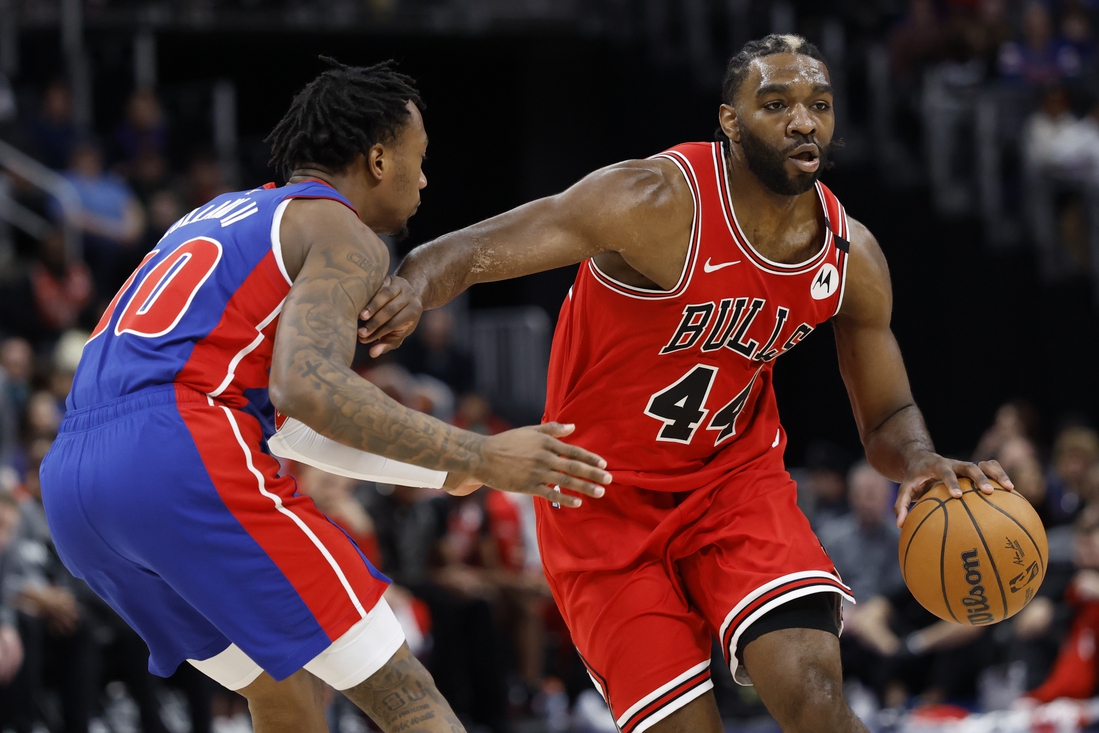 Feb 2, 2025; Detroit, Michigan, USA; Chicago Bulls forward Patrick Williams (44) dribbles defended by Detroit Pistons forward Ronald Holland II (00) in the first half at Little Caesars Arena. Mandatory Credit: Rick Osentoski-Imagn Images