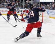 Nov 17, 2025; Columbus, Ohio, USA; Columbus Blue Jackets center Adam Fantilli (19) wrists a shot on goal against the Montreal Canadiens during the second period at Nationwide Arena. Mandatory Credit: Russell LaBounty-Imagn Images Kirill [...]