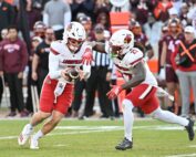 Nov 1, 2025; Blacksburg, Virginia, USA; Louisville Cardinals quarterback Miller Moss (7) hands the ball off to Louisville Cardinals running back Keyjuan Brown (22) during the fourth quarter at Lane Stadium. Mandatory Credit: Brian Bishop-Imagn [...]