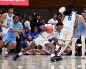 Nov 14, 2025; Durham, North Carolina, USA; Duke Blue Devils guard Caleb Foster (1) drives to the basket during the first half against the Indiana State Sycamores at Cameron Indoor Stadium. Mandatory Credit: Rob Kinnan-Imagn [...]