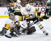 Oct 30, 2025; Saint Paul, Minnesota, USA; Pittsburgh Penguins goaltender Tristan Jarry (35) makes a save against Minnesota Wild left wing Kirill Kaprizov (97) during the second period at Grand Casino Arena. Mandatory Credit: Matt [...]