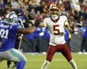 Nov 2, 2025; Landover, Maryland, USA; Washington Commanders quarterback Jayden Daniels (5) passes the ball as Seattle Seahawks defensive tackle Byron Murphy II (91) chases in the second quarter at Northwest Stadium. Mandatory Credit: Geoff [...]