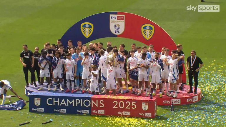 Leeds United celebrate with the Championship trophy in front of the away end after a late goal crowned them Champions