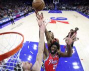 PHILADELPHIA, PENNSYLVANIA - DECEMBER 22: Scottie Barnes #4 of the Toronto Raptors blocks a lay up attempt by Joel Embiid #21 of the Philadelphia 76ers during the fourth quarter at the Wells Fargo Center on [...]