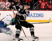 NEWARK, NEW JERSEY - FEBRUARY 06: Jack Hughes #86 of the New Jersey Devils takes a shot as Quinn Hughes #43 of the Vancouver Canucks defends in the overtime at Prudential Center on February 06, [...]