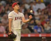 Jul 24, 2025; Anaheim, California, USA; Los Angeles Angels starting pitcher Yusei Kikuchi (16) reacts after giving up three runs in the fifth inning against the Seattle Mariners at Angel Stadium. Mandatory Credit: Jayne Kamin-Oncea-Imagn [...]