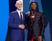 NEW YORK, NEW YORK - JUNE 22: Cason Wallace (R) poses with NBA commissioner Adam Silver (L) after being drafted tenth overall pick by the Dallas Mavericks during the first round of the 2023 NBA [...]