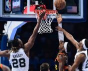 OKLAHOMA CITY, OKLAHOMA - NOVEMBER 14: Shai Gilgeous-Alexander #2 of the Oklahoma City Thunder puts up a shot between Charles Bassey #28 and Malaki Branham #22 of the San Antonio Spurs during the second half [...]
