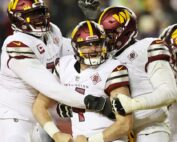 LANDOVER, MARYLAND - JANUARY 08: Sam Howell #14 of the Washington Commanders celebrates after scoring a touchdown in the third quarter of the game against the Dallas Cowboys at FedExField on January 08, 2023 in [...]