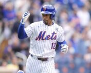 Jun 1, 2025; New York City, New York, USA; New York Mets shortstop Francisco Lindor (12) reacts to hitting a home run against the Colorado Rockies during the fifth inning at Citi Field. Mandatory Credit: [...]
