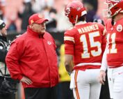 Dec 15, 2024; Cleveland, Ohio, USA; Kansas City Chiefs head coach Andy Reid talks to quarterback Patrick Mahomes (15) before the game between the Cleveland Browns and the Chiefs at Huntington Bank Field. Mandatory Credit: [...]