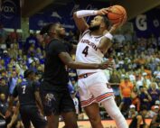 Nov 27, 2024; Lahaina, Hawaii, USA; Auburn Tigers forward Johni Broome (4) shoots over Memphis Tigers forward Dain Dainja (42) in the first half at Lahaina Civic Center. Mandatory Credit: Marco Garcia-Imagn Images Johni Broome [...]