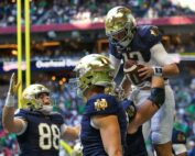 Notre Dame Fighting Irish quarterback Riley Leonard (13) celebrates with teammates after a touchdown against the Georgia Tech Yellow Jackets in the second quarter at Mercedes-Benz Stadium. Mandatory Credit: Brett Davis-Imagn Images No. 8 Notre [...]
