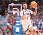 Kansas Jayhawks guard Zeke Mayo (5) dribbles the ball against North Carolina Tar Heels guard Ian Jackson (11) in the first half of the game inside Allen Fieldhouse Friday, Nov. 8, 2024. The 14th annual [...]
