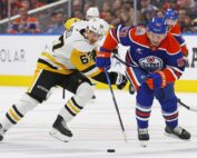 Oct 25, 2024; Edmonton, Alberta, CAN; Pittsburgh Penguins forward Rickard Rakell (67) tries to knock the puck away from Edmonton Oilers forward Jeff Skinner (53) during the third period at Rogers Place. Mandatory Credit: Perry [...]