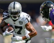 Sep 15, 2024; Baltimore, Maryland, USA; Las Vegas Raiders wide receiver Davante Adams (17) runs with the ball as Baltimore Ravens cornerback Marlon Humphrey (44) defends during the second half at M&T Bank Stadium. Mandatory [...]