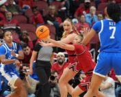 Kentucky's guard Tonie Morgan (5) passes the ball to forward Teonni Key (7) against Louisville in the KFC Yum! Center. November 22, 2025 Tonie Morgan's 3-pointer at the buzzer capped her 24-point performance as No. [...]
