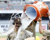 Jul 25, 2024; Washington, District of Columbia, USA; San Diego Padres pitcher Dylan Cease (84) is doused with a Gatorade cooler by Padres third baseman Manny Machado (13) and Padres third baseman Tyler Wade (14) [...]
