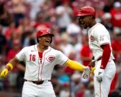 Cincinnati Reds outfielder Will Benson (30) reacts as he crosses home plate with Cincinnati Reds third baseman Noelvi Marte (16) after hitting a 3-run home run in the second inning of the MLB game between [...]