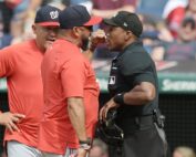 Jun 1, 2024; Cleveland, Ohio, USA; Washington Nationals manager Dave Martinez, middle, argues with umpire Malachi Moore after center fielder Jacob Young (not pictured) was called out on strikes during the second inning against the [...]