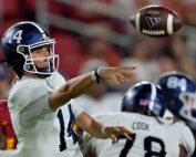 Sep 6, 2025; Los Angeles, California, USA; Georgia Southern Eagles quarterback Turner Helton (14) throws a pass in the second half against the USC Trojans at United Airlines Field at the Los Angeles Memorial Coliseum. [...]