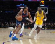 Feb 20, 2026; Los Angeles, California, USA; LA Clippers forward Kawhi Leonard (2) dribbles the ball against Los Angeles Lakers center Deandre Ayton (5) in the second half at Crypto.com Arena. Mandatory Credit: Kirby Lee-Imagn [...]