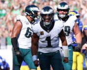 Sep 21, 2025; Philadelphia, Pennsylvania, USA; Philadelphia Eagles quarterback Jalen Hurts (1) reacts after a touchdown pass to wide receiver Devonta Smith (not pictured) during the fourth quarter against the Los Angeles Rams at Lincoln [...]