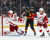 Dec 8, 2025; Vancouver, British Columbia, CAN; Detroit Red Wings defenseman Ben Chiarot (8) and Vancouver Canucks forward Aatu Raty (54) watch as goalie John Gibson (36) makes a save in the second period at [...]
