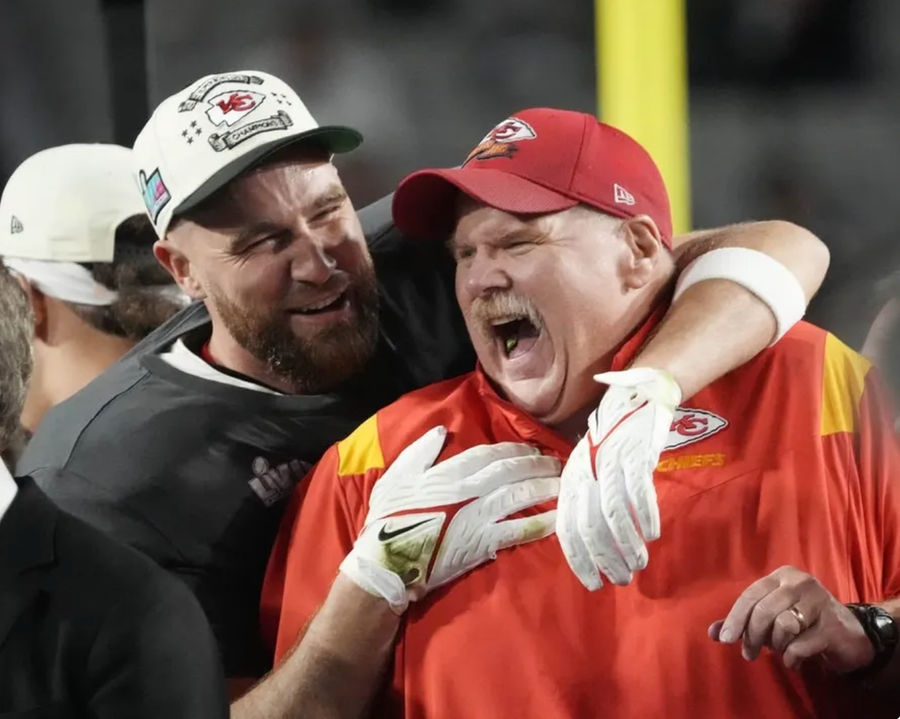 Feb. 12, 2023: Andy Reid and Travis Kelce celebrate the Kansas City Chiefs’ win over the Philadelphia Eagles in Super Bowl LVII at State Farm Stadium in Glendale, Arizona. credits: Michael Chow / USA TODAY NETWORK