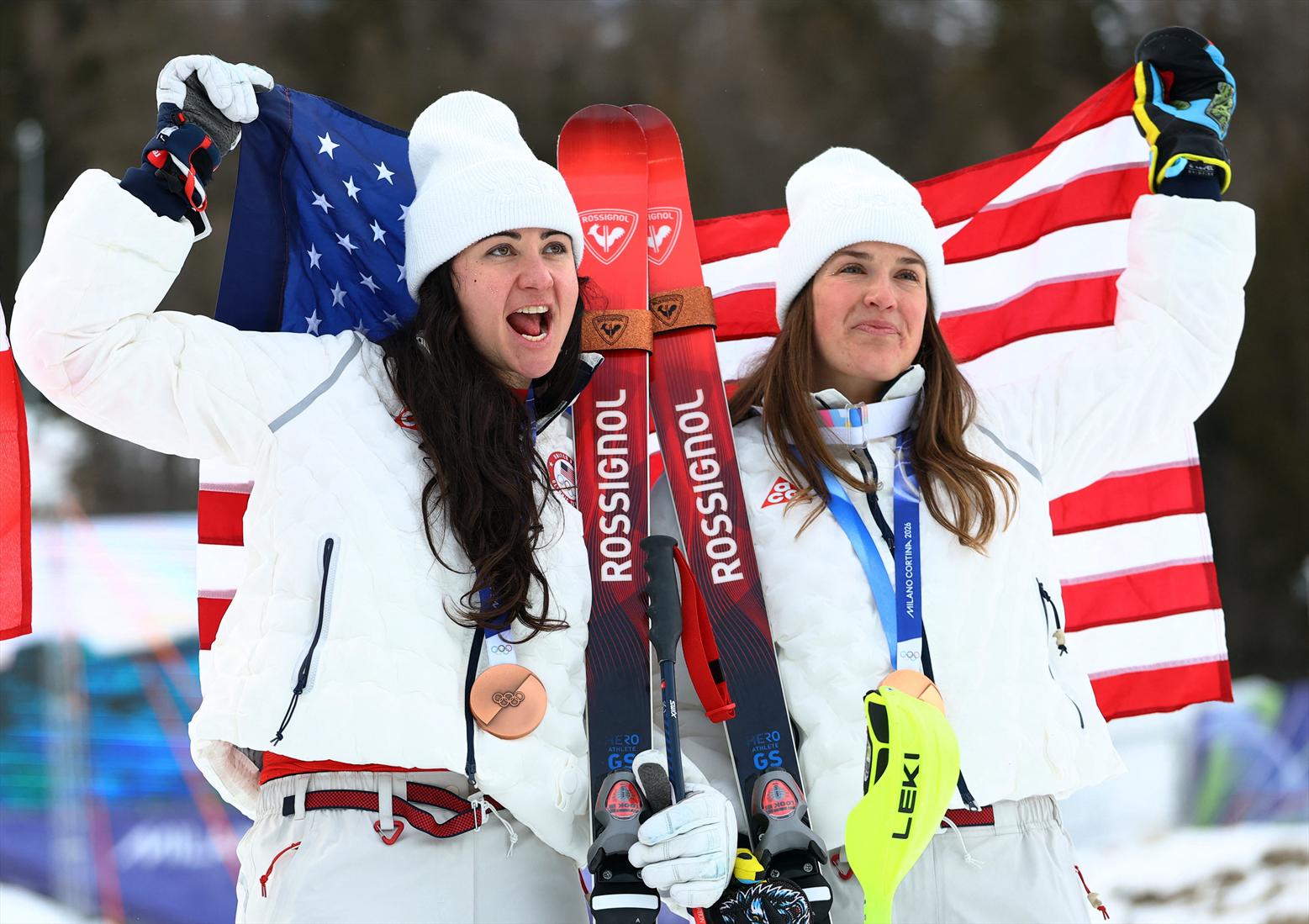 Milano Cortina 2026 Olympics – Alpine Skiing – Women’s Team Combined Victory Ceremony – Tofane Alpine Skiing Centre, Belluno, Italy – February 10, 2026. Bronze medalists Jacqueline Wiles of United States and Paula Moltzan of United States celebrate after the Women’s Team Combined